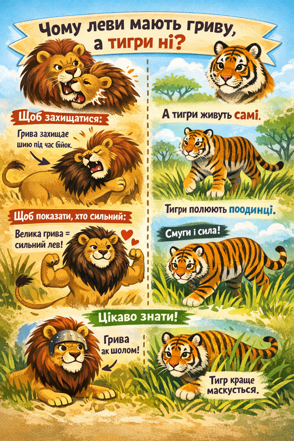 - Сигнал сили та здоров’я. Чим темніша і густіша грива, тим сильніший самць, що приваблює самиць. Леви живуть у прайдах (соціальних групах), де конкуренція за самок висока. Грива стає «рекламним банером» сили.