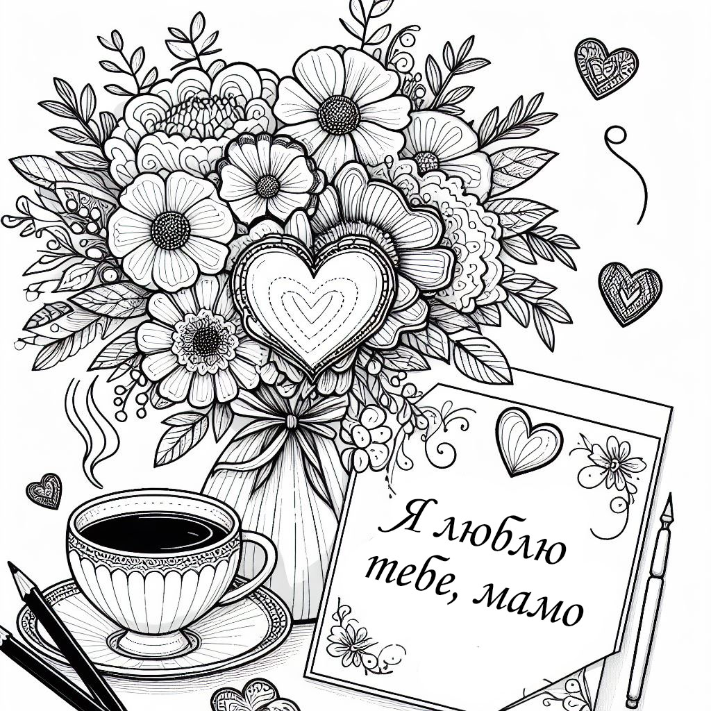 Розмальовки з квітами, серцями та подарунками, які символізують любов і вдячність до матері. Діти можуть розфарбувати квіти у яскраві кольори та додати свої власні деталі до малюнка.