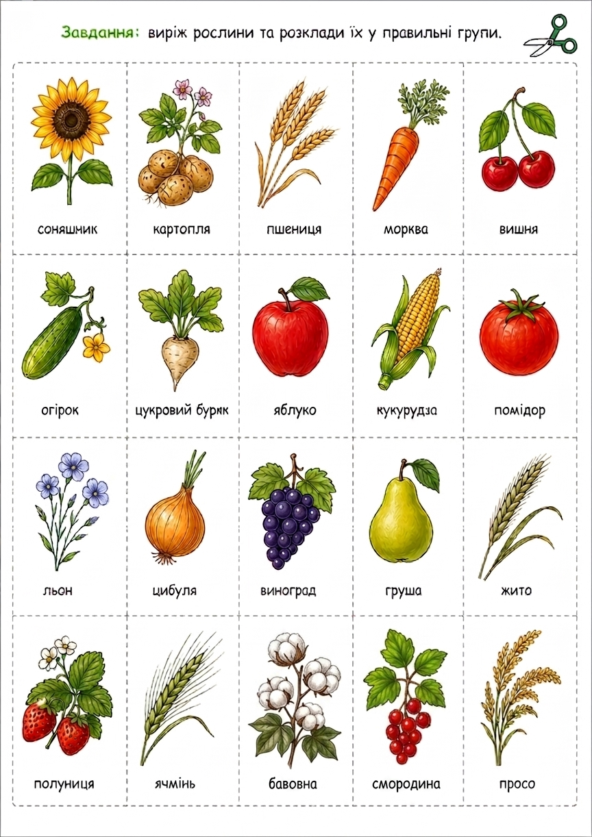 1. Домалювати одну рослину в кожну групу, якої не було на картинках (наприклад, рис — до зернових або кавун — до овочевих).
